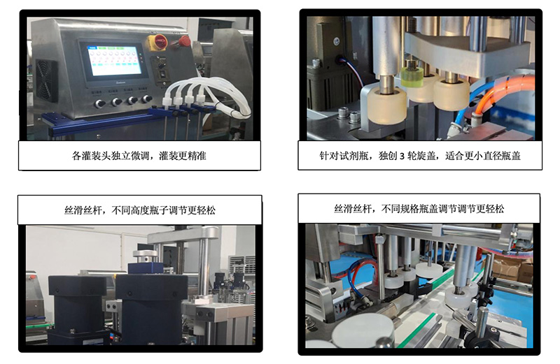 | 灌裝和旋蓋部分可通過(guò)手柄轉(zhuǎn)盤直接調(diào)整高度 | 需用工具調(diào)試,不方便、容易產(chǎn)生誤差 |